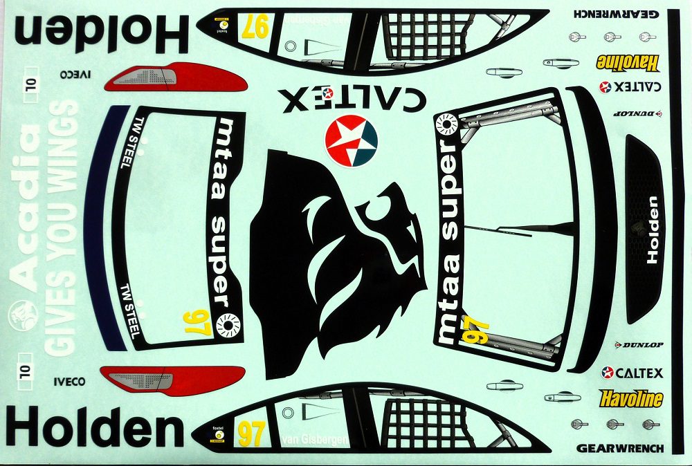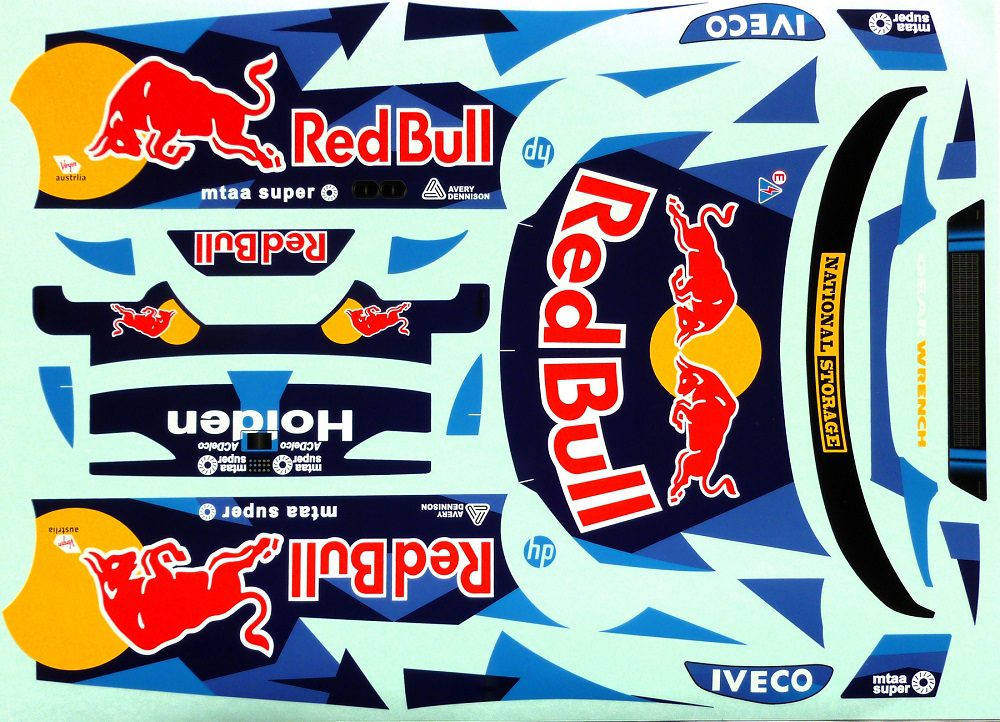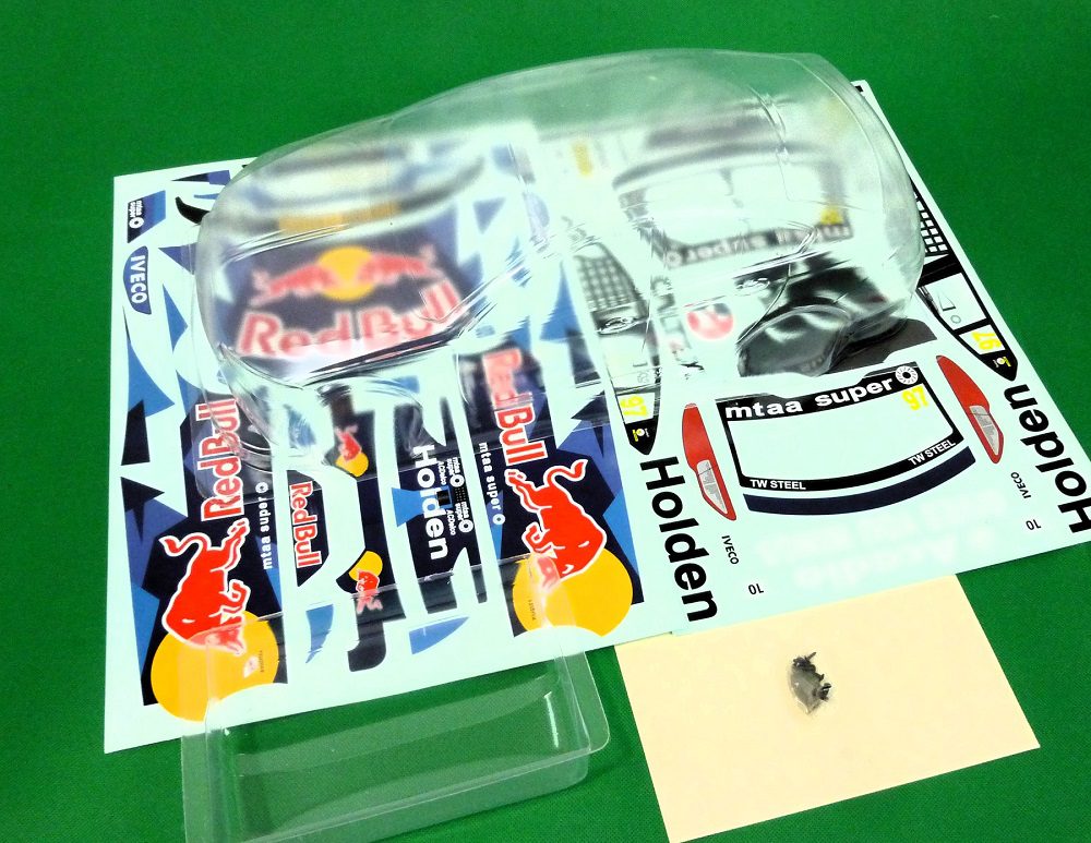 Body shell is as per pics #2 ~ #7 -Holden Commodore V8 Supercar -supplied with wing, rear view mirrors and mounting hardware- pic #8. Decals (not precut) supplied are as per pics #9 & #10 -Red Bull Livery. Window/paint masks, pic #2 are also supplied